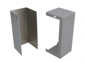 While our processes are much more sophisticated today, producing this product on state-of-the art CNC machines and automated bending cells, the box is the same. Made from sturdy .040” aluminum alloy, it has a clam-shell type design with one piece consisting of the top and two sides and the other is the bottom with the other two sides. The two parts then just snap together but can be more permanently attached with the provided sheet metal screws. It comes in 12 sizes ranging from 2 ¾” by 2 1/8” by 2 5/8” to 12” x 7” by 4”. The CU-3000 series comes in a natural finish and has a matching CU-2100 series that comes in smooth gray powder coat.