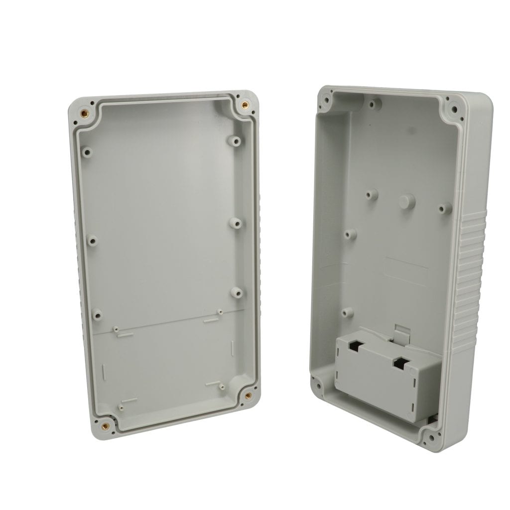 Style A is a rectangular enclosure that is available and with a 9-volt/AA battery compartment. The hand-held plastic box is made out of ABS plastic in a light gray finish, with UL94-HB flammability rating. It it is available with optional gasket, tilt stand, belt clip, and AA battery contact kit.