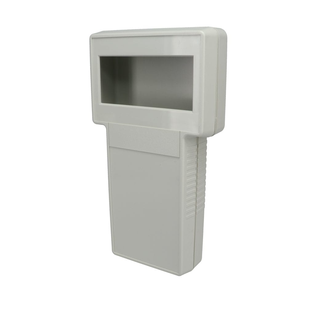 Style B is a T-shaped enclosure that is available with 4.00″ x 1.75″ LCD cutout in the display area, and with a 9-volt/AA battery compartment. The hand-held plastic box is made out of ABS plastic in a light gray finish, with UL94-HB flammability rating. It is available with optional sealing gasket, tilt stand, AA battery contact kit, and belt clip.