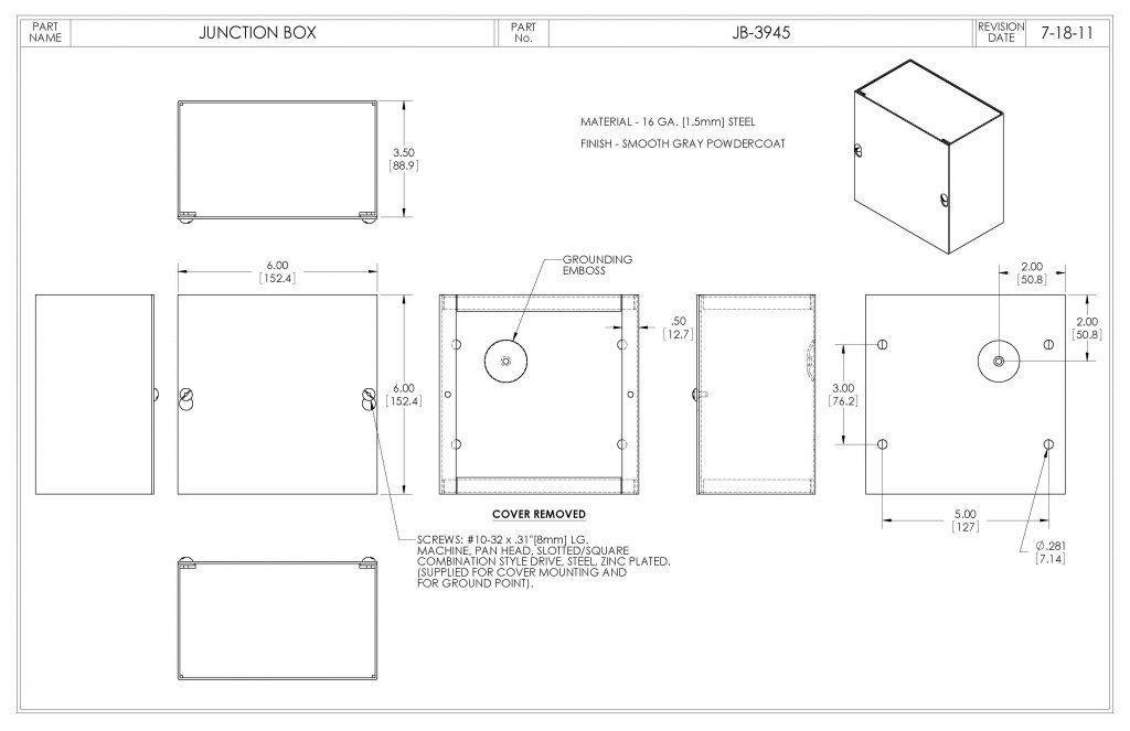 JB-3945 6.00" x 6.00" x 3.50" 6.006.003.50 5.88" x 5.88" x 3.38" No Knockouts