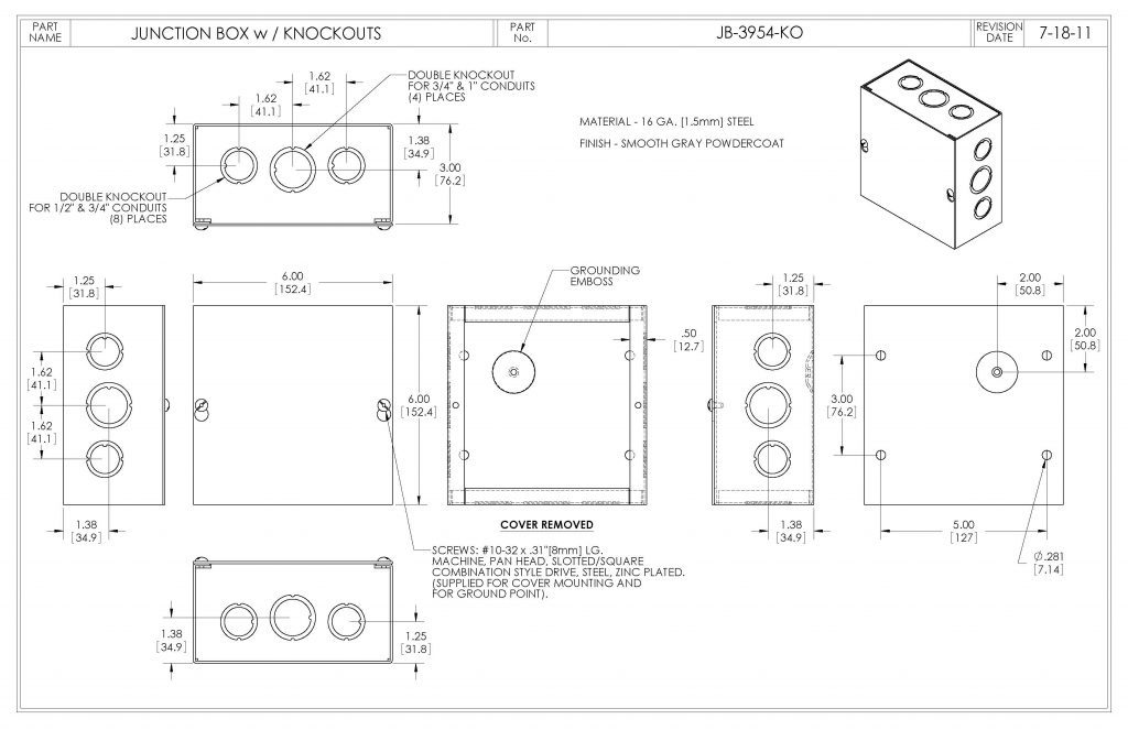 | JB-3954-KO | 6.00" x 6.00" x 3.00" 6.006.003.00 | 5.88" x 5.88" x 2.88" | Knockouts |
