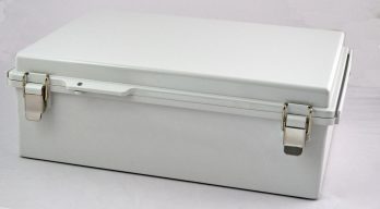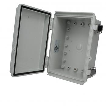 The PTQ Series of fiberglass boxes offers impressive strength and durability through its construction of polycarbonate plastic reinforced with 10% glass fibers and rugged stainless-steel latches. The boxes offer strong protection from harsh environments and meet IP67 (TUV) and UL (USA/CSA-C22) NEMA 1, 2, 4, 4x and 6 specifications. Clear covers are an option. UV stabilized for outdoor use (or indoor use), the boxes are ideal for PCB enclosures, junction boxes and other applications in the electrical and electronic industries.